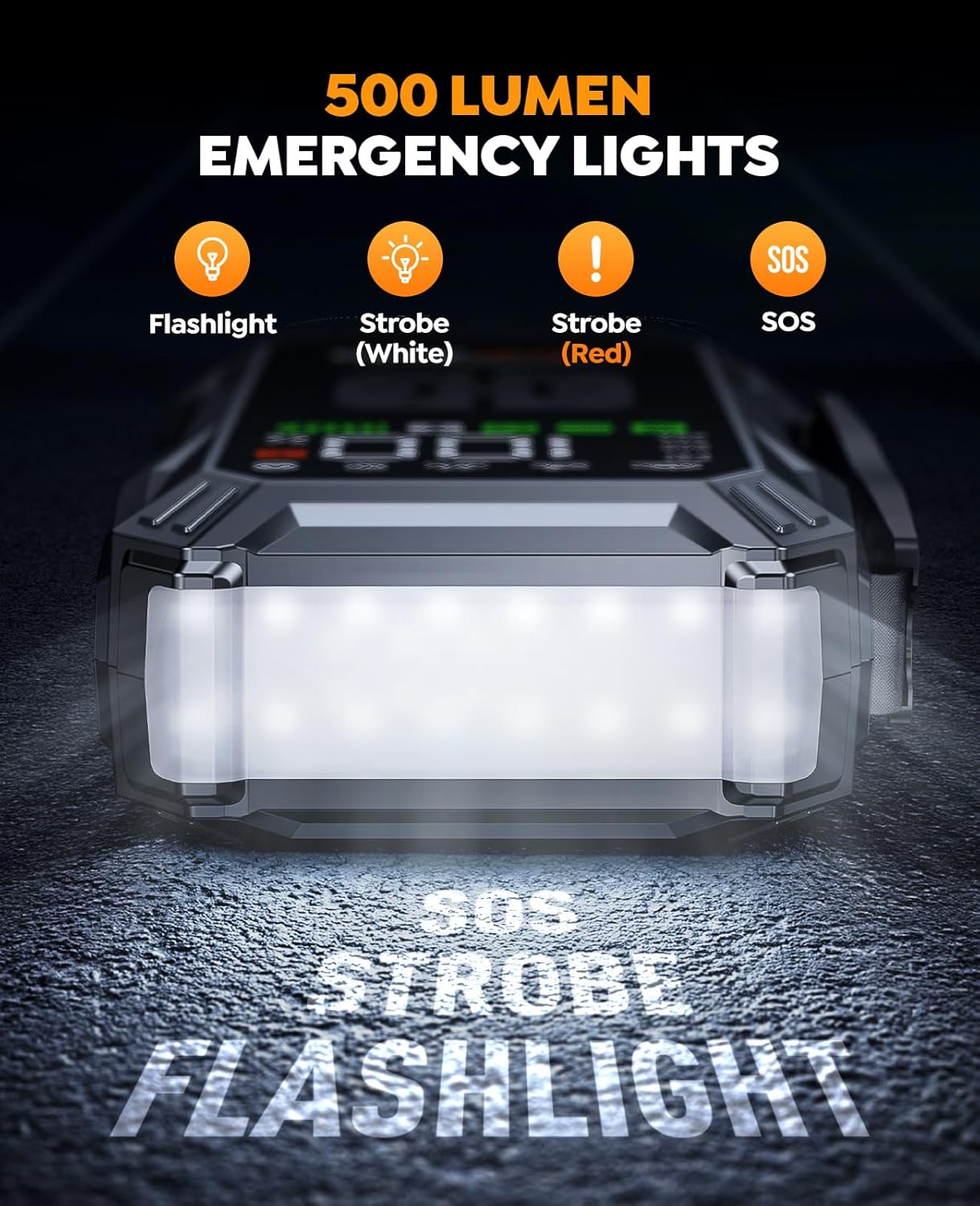 • EMERGENCY LIGHT FOR PEACE OF MIND. This jump starter has a 500 lumens LED light, and the LED light has dual colors and 4 modes: Lighting, Strobe(White), Strobe(Red), SOS. The bright LED light is a lifesaver for changing a tyre at night or signalling for help in the dark.
