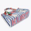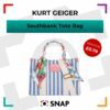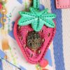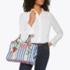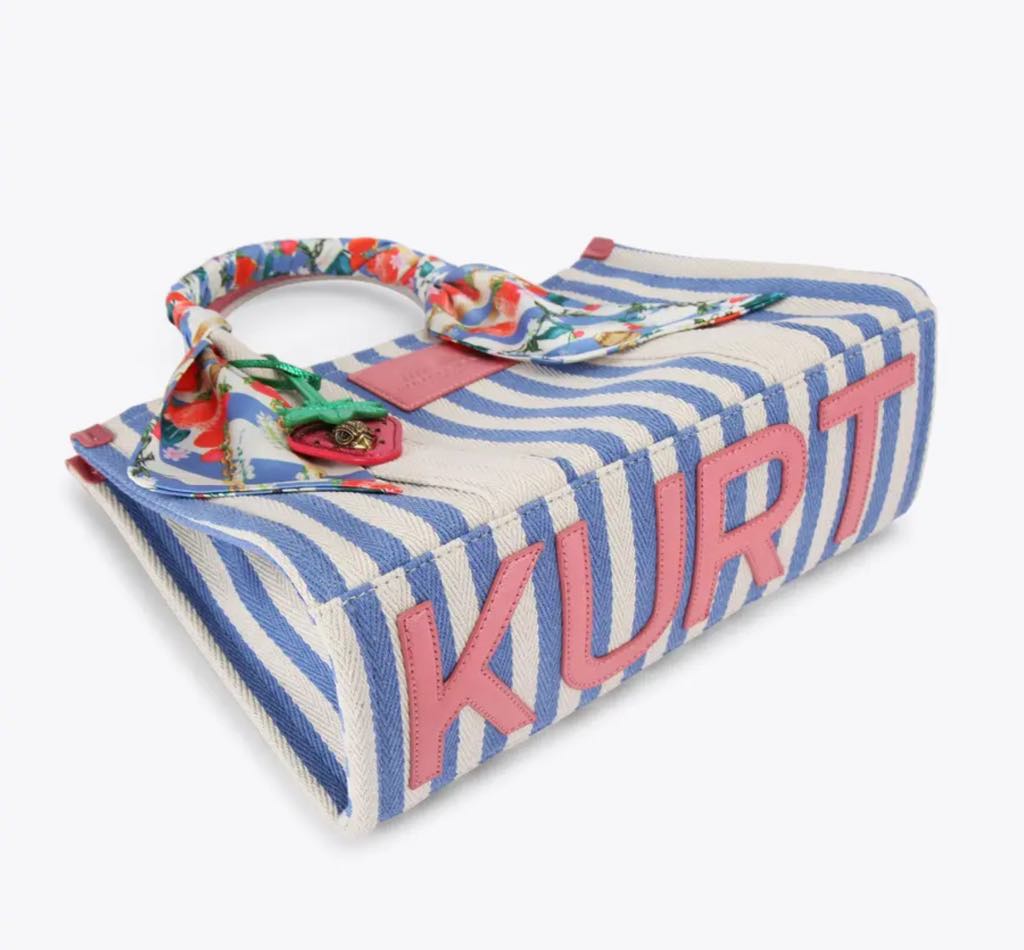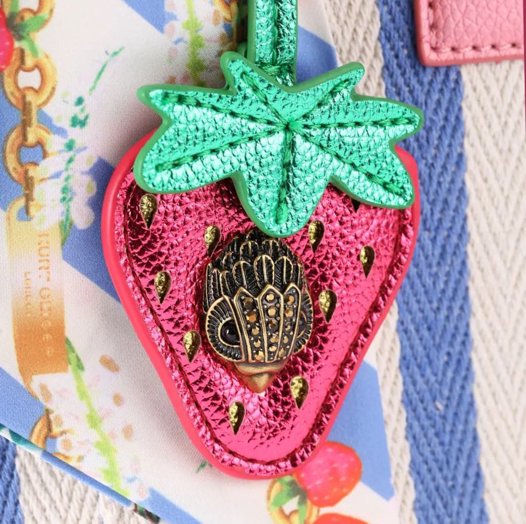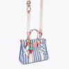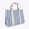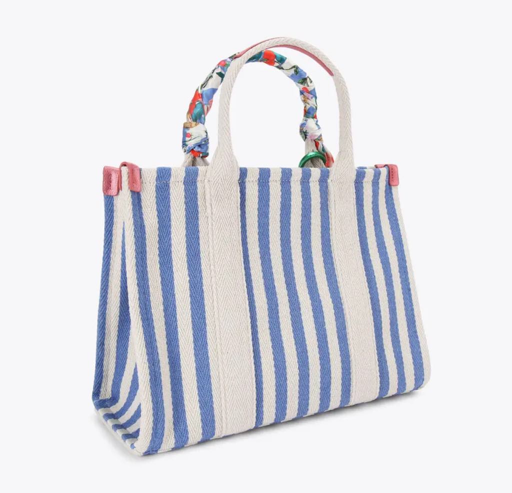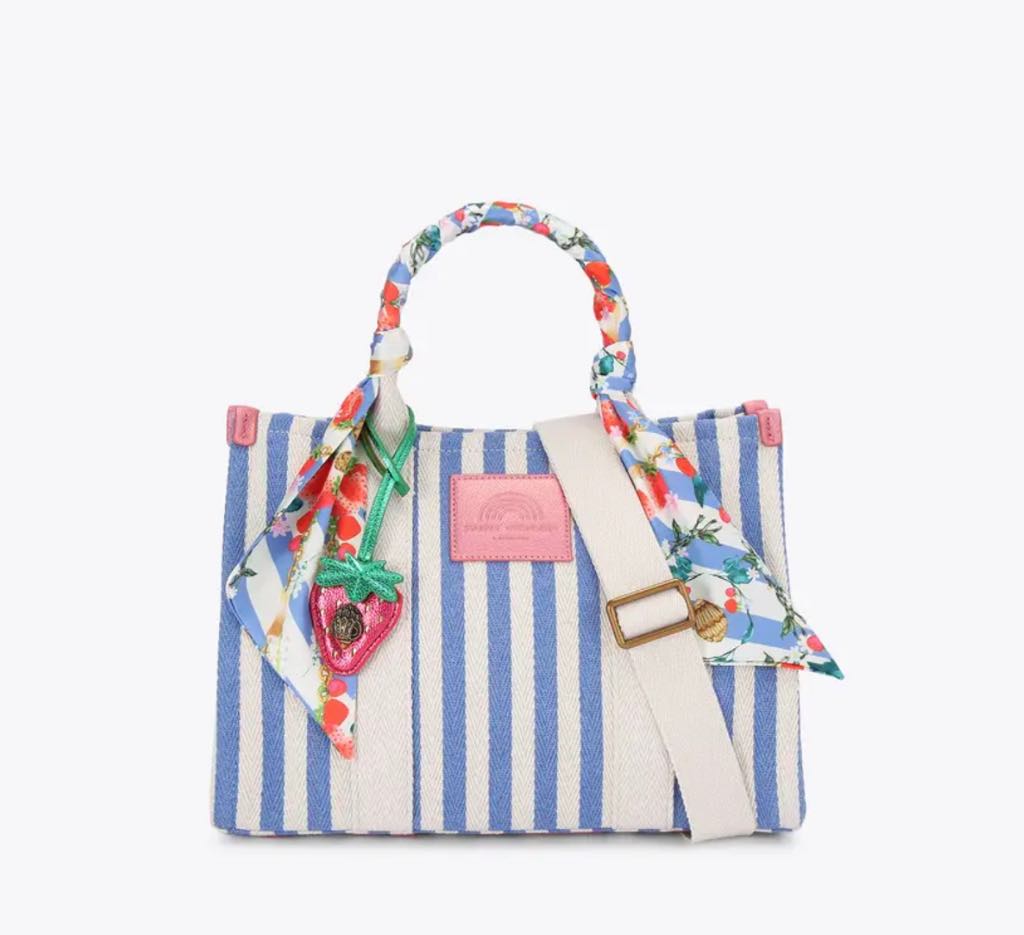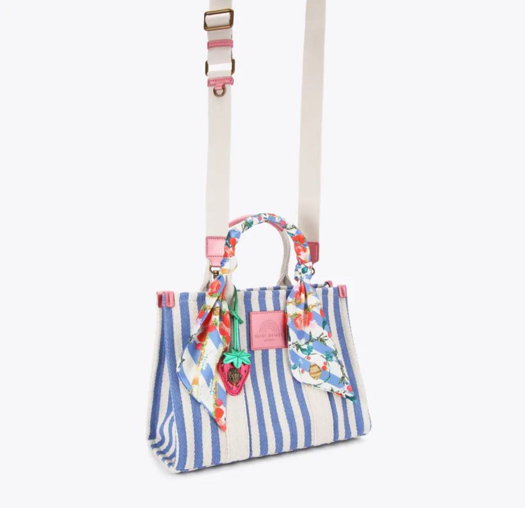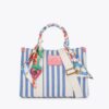 The Large Southbank Tote is crafted in a canvas fabric with bone and blue striped design. There is a unique strawberry tag charm on the front with antiqued brass eagle head on top.